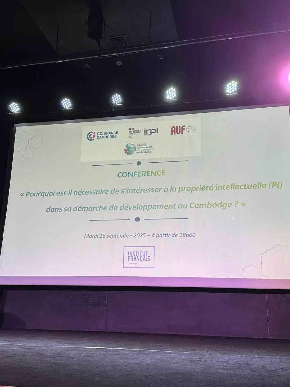 En partenariat avec l'Agence universitaire de la Francophonie (AUF Cambodge / Asie-Pacifique) et la CCI France Cambodge une conférence intitulée « Pourquoi est-il nécessaire de s’intéresser à la propriété intellectuelle (PI) dans sa démarche de développement au Cambodge ? » a été organisée le 16 septembre à l’Institut français du Cambodge.